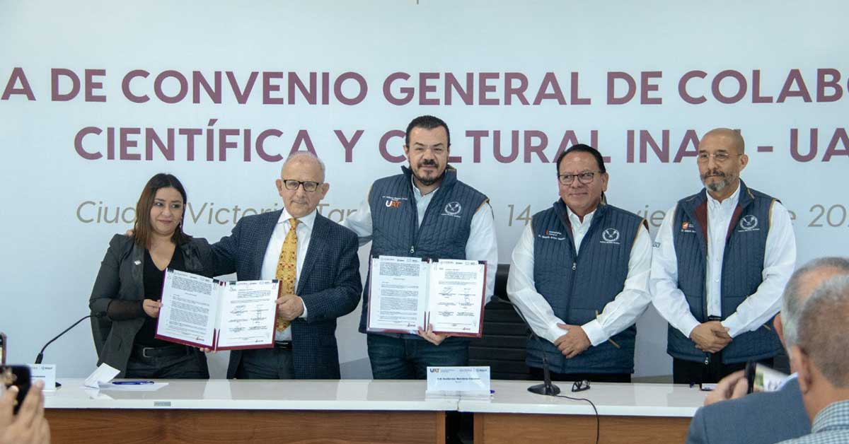 El C. P. Guillermo Mendoza Cavazos, rector de la Universidad Autónoma de Tamaulipas (UAT), firmó un convenio de colaboración con el antropólogo Diego Prieto Hernández, director general del Instituto Nacional de Antropología e Historia (INAH), con la finalidad de que los expertos de esta casa de estudios participen en las acciones para la conservación del patrimonio histórico y cultural que desarrolla el organismo en la entidad.