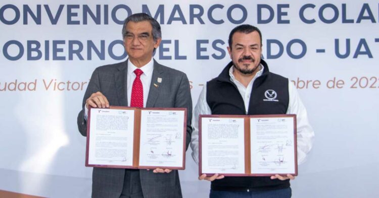 Como parte de las actividades para conmemorar el 72 aniversario de la Universidad Autónoma de Tamaulipas (UAT), el gobernador, Dr. Américo Villarreal Anaya, y el rector, C. P. Guillermo Mendoza Cavazos, firmaron un convenio de colaboración que, en el marco de las relaciones entre el Gobierno de Tamaulipas y la UAT, dará un nuevo impulso a la generación de programas y proyectos en beneficio de la comunidad y el desarrollo de la entidad.