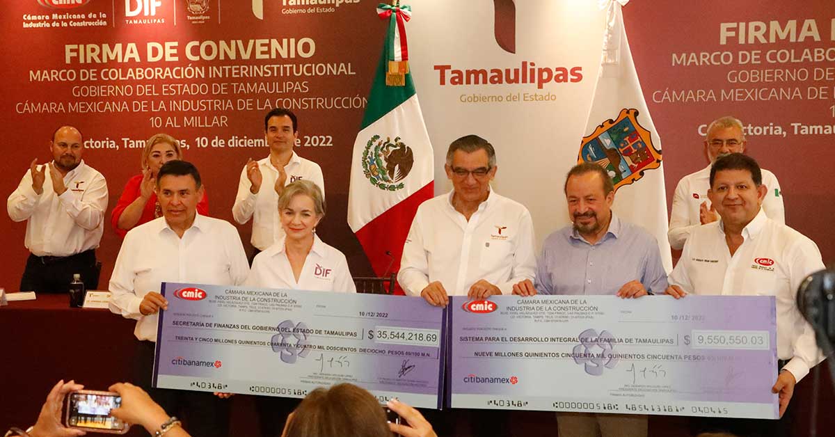 Ciudad Victoria, Tamaulipas. -Ayer sábado, se llevó a cabo la firma del Convenio Marco de Colaboración Interinstitucional entre el Gobierno del Estado y la Cámara Mexicana de la Industria de la Construcción (CMIC), donde además se hizo entrega de un donativo por 35 millones 544 mil 218 pesos para el Gobierno Estatal y otro por 9 millones 550 mil 550 pesos para el sistema DIF.