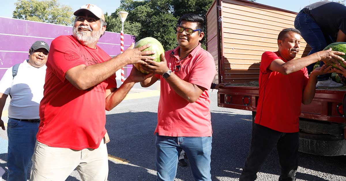 Ciudad. Victoria, Tamaulipas .-Dando seguimiento al Plan de Apoyo a los municipios que puso en marcha el gobernador del Estado Americo Villarreal, el Sistema para el Desarrollo Integral de la Familia de Tamaulipas, presidido por María de Villarreal, ha dispersado 9 toneladas de sandía, provenientes de productores tamaulipecos.