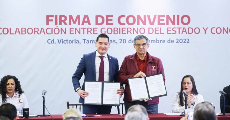 Al firmar el convenio entre el gobierno de Tamaulipas y el Consejo Nacional de Normalización y Certificación de Competencias Laborales (CONOCER), representado por Rodrigo Castañeda Cerdán, director de Desarrollo y Promoción en el sector gobierno, durante un evento protocolario realizado en el salón Independencia de Palacio de Gobierno, señaló que se han sumado a la política laboral del presidente de México Andrés Manuel López Obrador, para que aumente la productividad, pero también para que se retribuya con justicia el salario y se cumplan con las prestaciones laborales de ley.