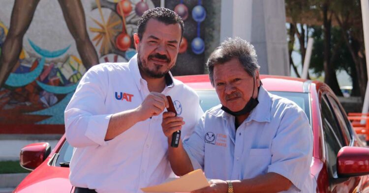 El C. P. Guillermo Mendoza Cavazos, rector de la Universidad Autónoma de Tamaulipas (UAT), entregó un automóvil de reciente modelo al ganador del sorteo organizado entre el personal del Sindicato Único de Trabajadores (SUTUAT).