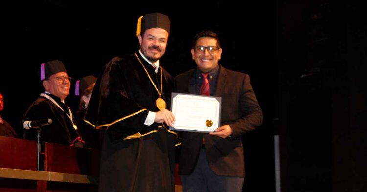 El docente e investigador universitario recibió el galardón de manos del C. P. Guillermo Mendoza Cavazos, rector de la UAT, durante la Ceremonia de Entrega de Reconocimiento al Mérito Universitario llevada a cabo en el Aula Magna Herman H. Fleishman del Centro Universitario Sur.