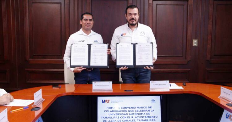 La Universidad Autónoma de Tamaulipas (UAT) firmó un convenio de colaboración con el Ayuntamiento de Llera de Canales, mediante el cual investigadores de esta casa de estudios apoyarán a los productores de ese municipio en la elaboración de cadenas productivas, entre otras acciones.