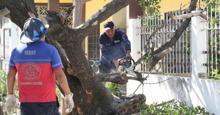 Personal de bomberos, con apoyo de Servicios Públicos y Dirección de Seguridad Tránsito y Vialidad, implementaron acciones rápidas para la poda y retiro de 15 árboles caídos y un semáforo que colapsó con un anunció vial.