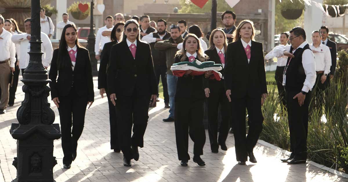 La presidenta del Sistema DIF Claudette Canturosas Villarreal, junto a la alcaldesa Carmen Lilia Canturosas Villarreal, fueron las encargadas de izar la bandera de México, mientras la centenaria banda municipal entonaba el himno nacional.