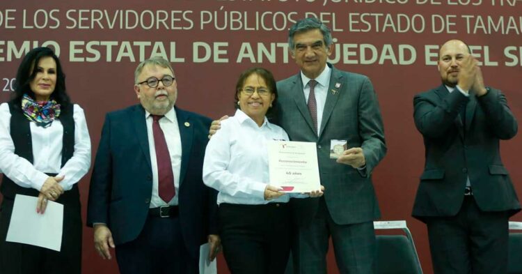 En el marco de la entrega del Premio Estatal de Antigüedad en el Servicio Público que presidió el gobernador Américo Villarreal Anaya, donde anunció que el salario del nivel 50 sube de 3 mil 480 a 6 mil 334 pesos, el secretario de Administración brindó un reconocimiento a todo el personal adscrito al servicio público y destacó su esfuerzo diario.