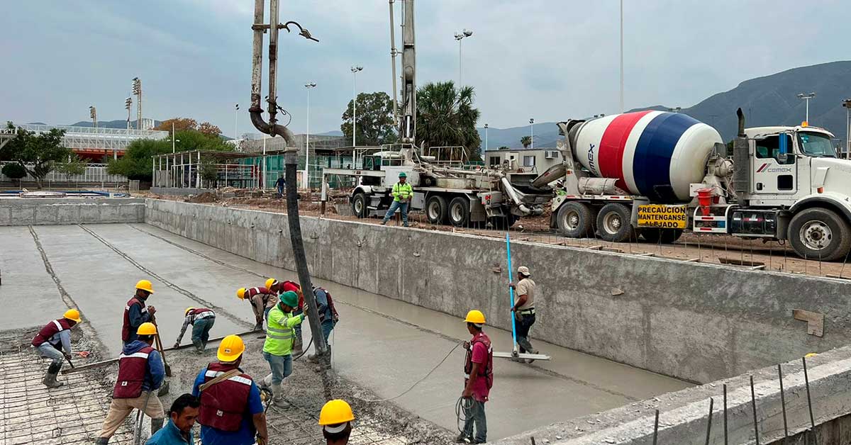En días recientes, se trabajó en el colado del firme de concreto reforzado con acero e impermeabilizante integral, además de trabajos de infraestructura hidráulica, en el cuarto de máquinas suministrando dos equipos de filtrado, bombeo, toma y retorno de agua, baños y vestidores.