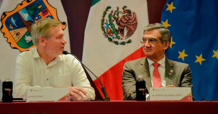 En conferencia de prensa en el Salón Independencia de Palacio de Gobierno y luego de una reunión de trabajo con el gobernador Américo Villarreal e integrantes del gabinete estatal, Gautier Mignot anunció que en el mes de junio llegarán a Tamaulipas embajadores de 19 países integrantes de la Unión Europea, para fortalecer relaciones comerciales y conocer el gran potencial y las magníficas oportunidades que ofrece Tamaulipas, por sus condiciones naturales y geográficas.
