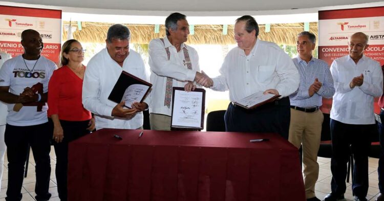 Fue en la palapa de la Laguna del Champayán de Altamira, donde signaron el convenio el alcalde de Altamira, Armando Martínez Manríquez y el presidente de la Asociación de Industriales del Sur de Tamaulipas, Luis Rafael Apertti Llovet y como testigo de honor, el gobernador Américo Villarreal Anaya.