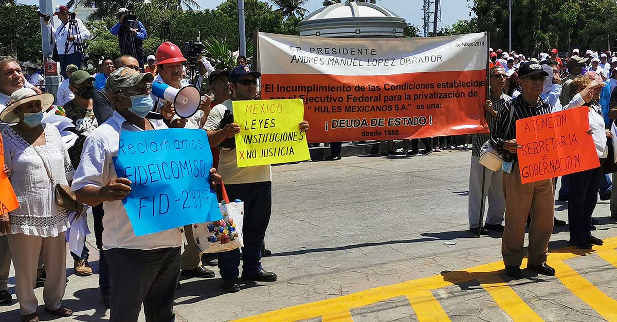 Además, de consignas con leyendas que decían: “Señor presidente, Andrés Manuel López Obrador, el incumplimiento de las condiciones establecidas por el Ejecutivo Federal para la privatización de Hules Mexicanos, S. A de C.V, es una; ¡deuda de estado!”.