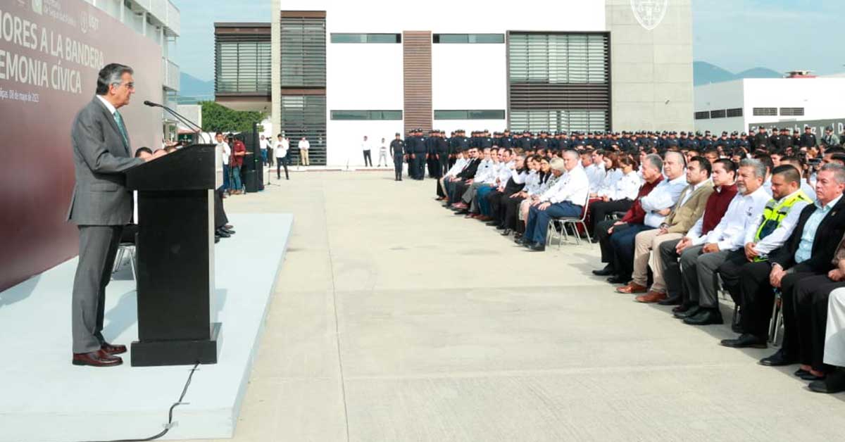 Ante maestros, instructores y alumnos de este centro de estudios policiales, el gobernador destacó que el reto de restablecer la paz y la seguridad es uno de los grandes compromisos del Gobierno de la Transformación.