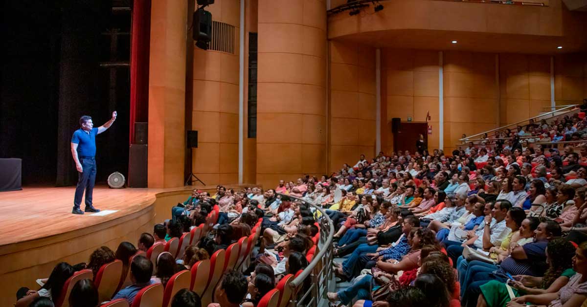“Mi reencuentro contigo, por el placer de vivir”, fue la conferencia que se ofreció ante un lleno total del teatro principal del recinto, en donde el público ya lo esperaba con ansias, después de tres años de no presentarse en esta ciudad.