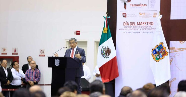 Al encabezar este mediodía la entrega de reconocimientos, estímulos y medallas al mérito docente, en el marco de la celebración del Día del Maestro, el gobernador reiteró su compromiso para trabajar a fin de mejorar la posición de Tamaulipas en los indicadores nacionales y compensar el esfuerzo de las y los trabajadores de la educación, haciendo valer y respetando sus derechos, además de mejorar las condiciones generales, la enseñanza, el aprendizaje y revertir el rezago en materia educativa.
