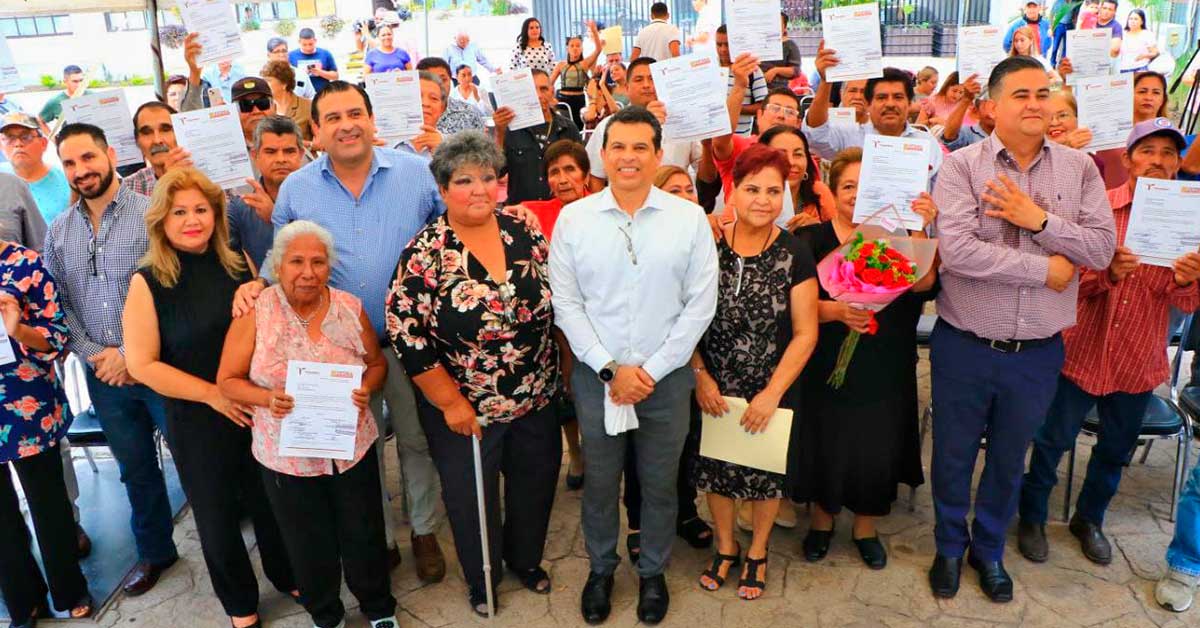 En la emotiva ceremonia, las y los trabajadores beneficiados estuvieron acompañados por sus familias y se sumaron al reconocimiento el Oficial Mayor Alberto Loya López, el secretario del Ayuntamiento Hugo Reséndez Silva y la secretaria de Bienestar Social Lorena Zapata Medina.