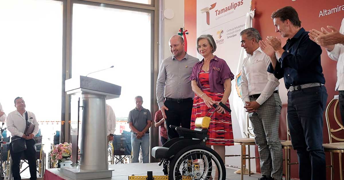 Altamira, Tamaulipas. En el marco de las actividades que se realizaron en las instalaciones del Centro de Rehabilitación e Inclusión Infantil Teletón (CRIT) ubicado en el municipio de Altamira, el Sistema DIF Tamaulipas que preside la doctora María Santiago de Villarreal, recibió un donativo de 20 sillas de ruedas.