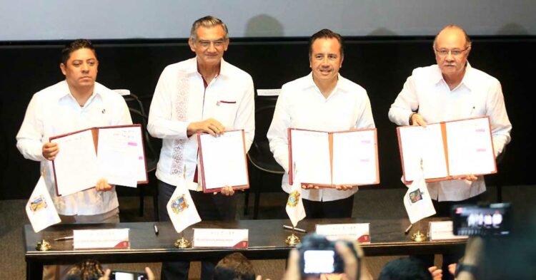 Ciudad Victoria, Tamaulipas.- Los gobernadores de Tamaulipas, San Luis Potosí y Veracruz y el representante del gobierno de Nuevo León firmaron el Convenio Marco de Colaboración y Coordinación en Materia de Seguridad Pública, lo que representa el primer paso para sumar esfuerzos y trabajar de manera conjunta a fin de seguir recuperando la paz y tranquilidad en las cuatro entidades.