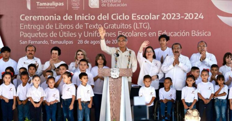 San Fernando, Tamaulipas.- En el marco del inicio del ciclo escolar 2023-2024 y la entrega simbólica de más de tres millones de libros de texto gratuitos y 48 mil 937 paquetes de útiles y uniformes escolares de educación básica, el gobernador Américo Villarreal Anaya llamó a conjuntar voluntades entre magisterio, padres de familia, alumnas, alumnos y la sociedad en su conjunto, a fin de lograr mejores niveles de vida y poder entregar mejores generaciones.