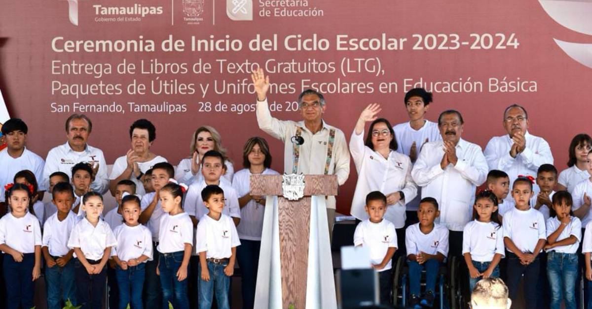 San Fernando, Tamaulipas.- En el marco del inicio del ciclo escolar 2023-2024 y la entrega simbólica de más de tres millones de libros de texto gratuitos y 48 mil 937 paquetes de útiles y uniformes escolares de educación básica, el gobernador Américo Villarreal Anaya llamó a conjuntar voluntades entre magisterio, padres de familia, alumnas, alumnos y la sociedad en su conjunto, a fin de lograr mejores niveles de vida y poder entregar mejores generaciones.