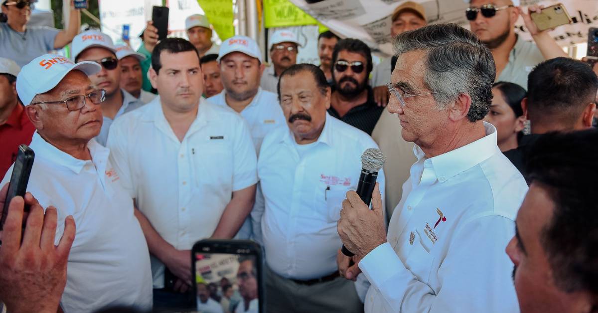 Durante el encuentro, el dirigente de la Sección 30 del SNTE, Arnulfo Rodríguez, hizo un reconocimiento al gobernador por acudir personalmente y dirigirse a las y los maestros y lo consideró su «amigo».