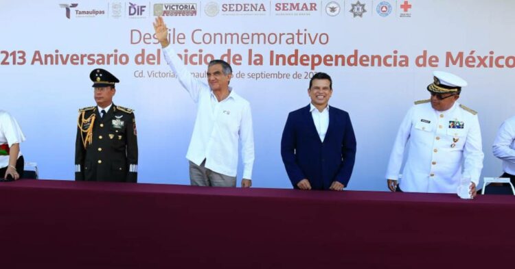 Acompañado por el general Julio César Islas Sánchez, comandante de la 48a. zona militar, el vicealmirante Gabriel Pablo González Contreras, comandante de la Primera Región Naval y por los asistentes que disfrutaron el desfile a lo largo del Bulevard Tamaulipas, el gobernador Américo Villarreal presenció la marcha de los contingentes de la Secretaría de la Defensa Nacional, Pentatlón Militarizado, Guardia Nacional, Guardia Estatal, Cruz Roja Mexicana y los elementos del agrupamiento montado de la Guardia Estatal.