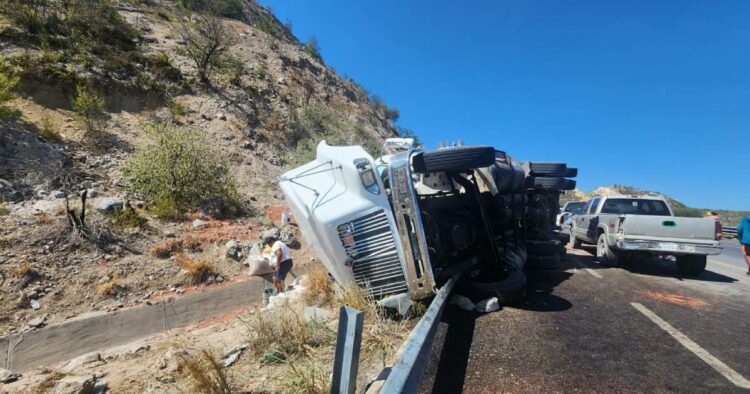 Jaumave, Tamaulipas.- A consecuencia de la volcadura de un tractocamión que transportaba sorgo, la circulación se encuentra cerrada en un carril de norte a sur de la Carretera Estatal 126 “Rumbo Nuevo”.