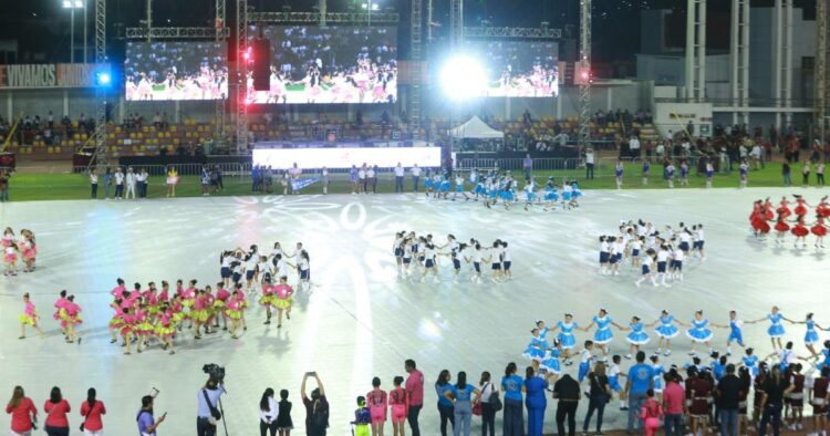 Los vestuarios de todos colores iluminan la noche que ha caído en la capital tamaulipeca, mientras que mil alumnos normalistas y universitarios forman mosaicos monumentales en las tribunas en donde se lee con gigantes letras el nombre de Tamaulipas y después se forma la imagen del emblemático colibrí.