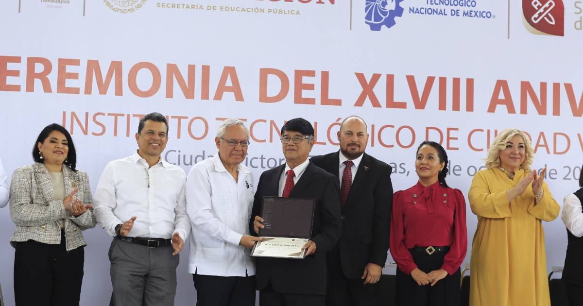 Al encabezar la ceremonia cívica de honores, en el marco del 48 aniversario de la fundación del Tecnológico de Ciudad Victoria, el secretario general de Gobierno, junto al director general del Tecnológico Nacional de México, Ramón Jiménez López, develó una placa con la que a partir de hoy se denomina Avenida Tecnológico, a la vialidad ubicada frente al plantel y además entregó reconocimientos a tres maestros con más de 40 años de servicio en la institución: Yolanda Dávila López, Wilfrido Ponce De la Fuente y Renato Romo Ramírez.