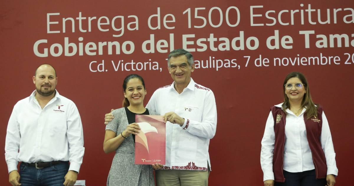 Ciudad Victoria, Tamaulipas.- El gobernador Américo Villarreal Anaya presidió la ceremonia de entrega de 1,500 escrituras que garantizan la certeza jurídica y la propiedad de familias que en algunos casos esperaron hasta 22 años para tener en sus manos este documento y aseguró que en Tamaulipas ya no debe de haber asentamientos irregulares, “eso se tiene que acabar”, afirmó.