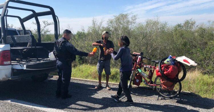Soto la Marina, Tamaulipas.- Personal de la Guardia Estatal en el municipio de Soto la Marina apoyó con hidratación, alimentos y seguridad en su paso por Tamaulipas a una pareja de cicloviajeros provenientes de Japón quienes se dirigen hacia Argentina.