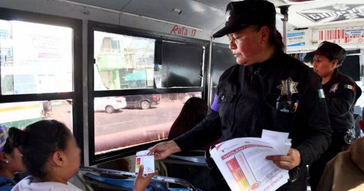 La encargada de la Guardia Estatal de Género, oficial Claudia Elizabeth Núñez Álvarez, explicó que a manera de estrechar la cercanía, elementos pertenecientes a esta unidad de la Guardia Estatal abordan las unidades para entregar violentómetros, trípticos y explicar las diferentes funciones que realizan.