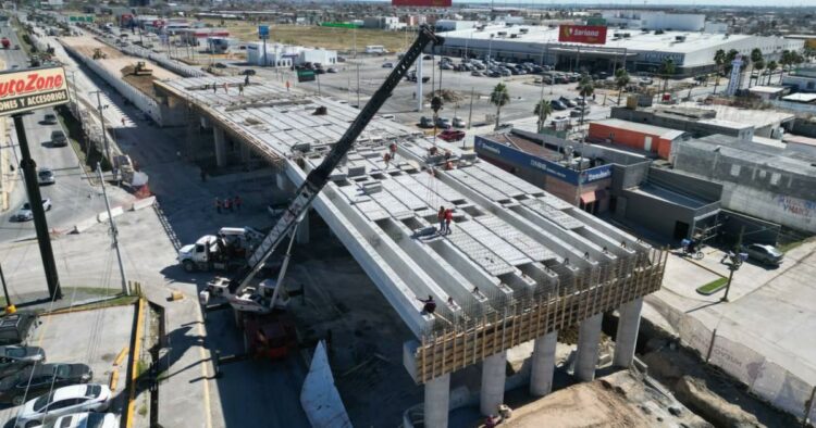 Nuevo Laredo, Tamaulipas.- Un avance del más del 60 por ciento se lleva en los trabajos de construcción del Puente Vehicular por Calzada de los Héroes y Eva Samano con el que se mejorará la movilidad del poniente de la ciudad.