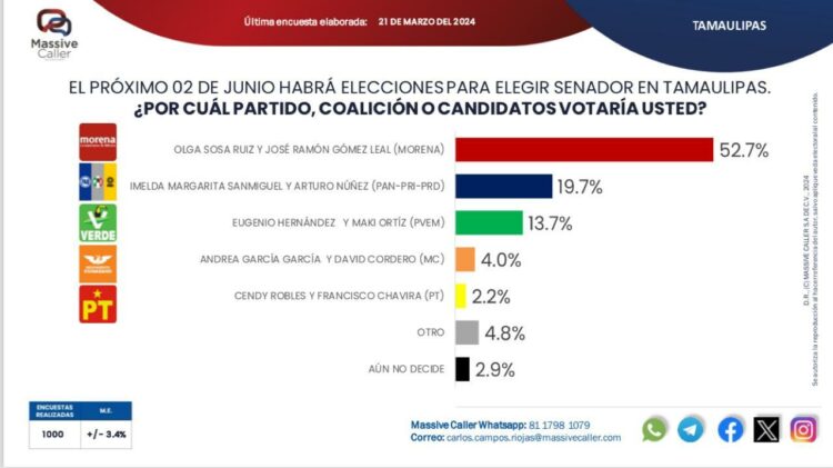 Ciudad Victoria.- La fórmula morenista del Senado por Tamaulipas, que encabeza Olga Patricia Sosa Ruíz llevando como compañero de fórmula a José Ramón Gómez Leal, obtuvo un 52.7% en la intención del voto para elegir senador en el estado, de acuerdo a la encuesta más reciente aplicada por la empresa encuestadora Massive Caller, con fecha 21 de marzo del presente año.