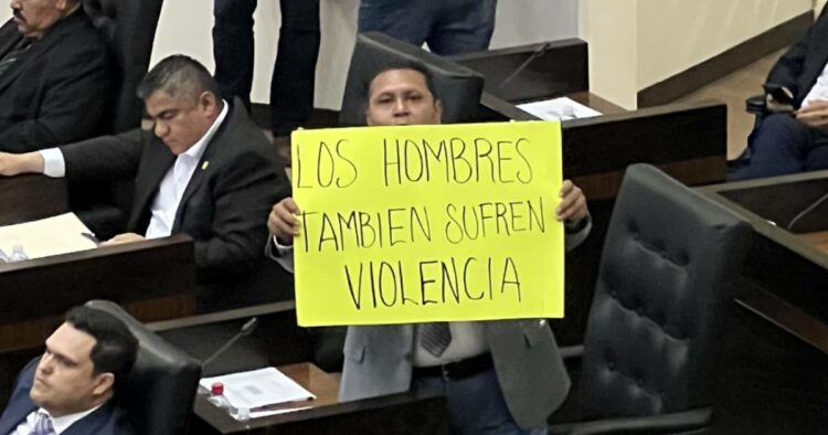 Apoyado con cartulinas manuscritas el legislador escribió algunas leyendas como «Los hombres también sufren violencia», y después de mostrarlas a los medios de comunicación, colocó dichos carteles en una de las paredes de su cubículo, durante el desarrollo de los trabajos legislativos de hoy lunes 6 de mayo.