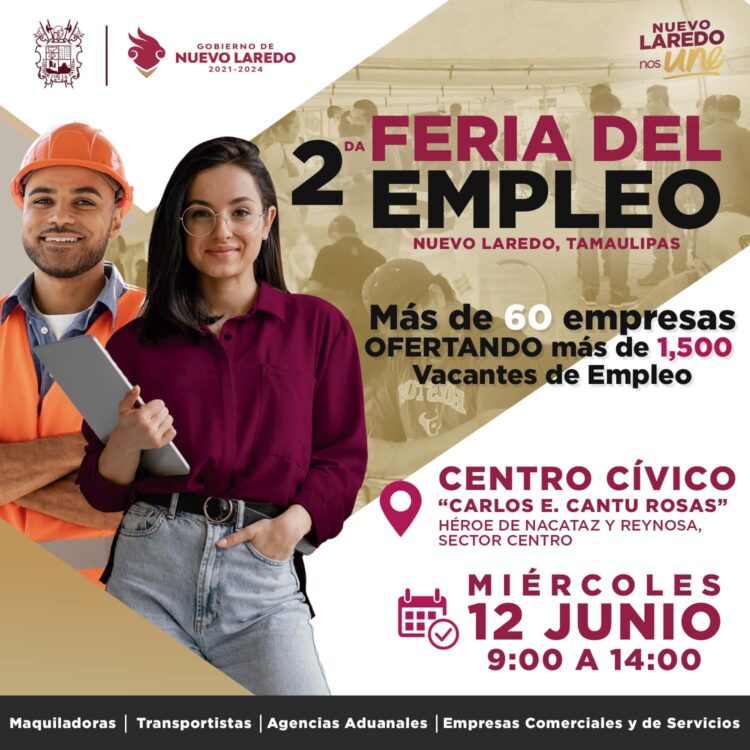 La cita es el Centro Cívico “Carlos Cantú Rosas”, donde más de 60 empresas de rubros como maquiladoras, autotransporte, agencias aduanales, negocios comerciales o de servicios, entre otros, estarán contratando.