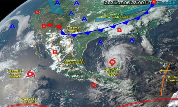 La tormenta tropical Beryl se desplazará sobre el Golfo de México, dirigiéndose a las costas de Tamaulipas, sus bandas nubosas generarán lluvias fuertes a muy fuertes en el noreste, oriente y sureste del país, incluida la Península de Yucatán.