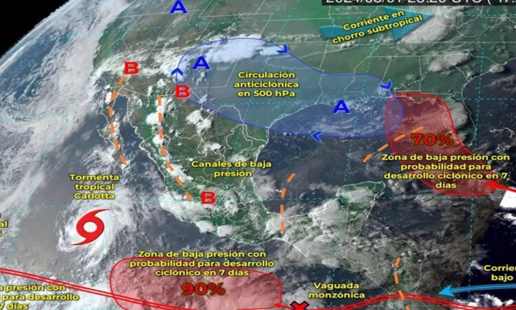 De acuerdo con el comunicado del organismo dependiente de la Comisión Nacional del Agua (Conagua), canales de baja presión extendidos en el norte, occidente, centro, sur y sureste de la República Mexicana, en interacción con la entrada de humedad del mar Caribe y la generada por la zona de baja presión con potencial ciclónico al sur de las costas de Oaxaca, así como la inestabilidad en niveles altos, propiciarán chubascos con lluvias puntuales fuertes.