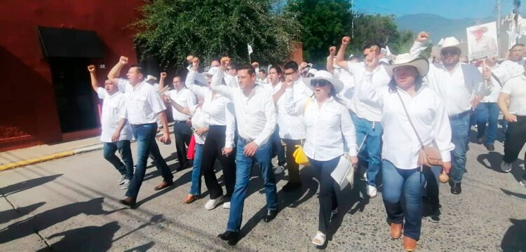 Tras una marcha jubilosa y entusiasta por varias cuadras, iniciando por el 22 Hidalgo, luego por la 21 para bajar por Morelos y llegar a las oficinas estatales de la Sección 10, ubicadas en el 21 y 22 Morelos, Obeso Treviño arribó con sus dos testigos para registrarse junto con todos los integrantes de su planilla.