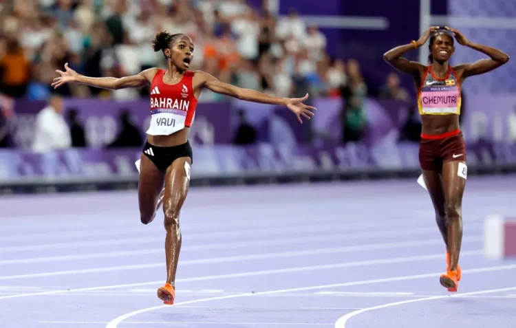 Y es la campeona mundial Yavi, nacida en Kenia, compitiendo por Barhein, con 8:52.76, bajando más de seis segundos del antiguo récord olímpico de 2008, con Chemutai ganando plata en un récord nacional 8:53.34 y el bronce Cherotich de Kenia en un mejor de 8:55.15 personal.