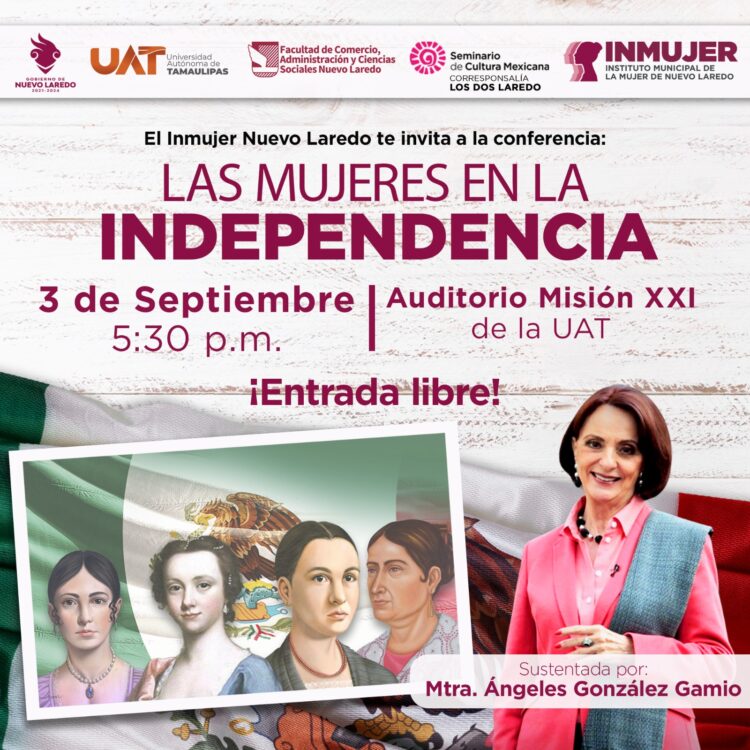 El Instituto Municipal de la Mujer, en coordinación con la Facultad de Comercio de la Universidad Autónoma de Tamaulipas y el Seminario de Cultura Mexicana, llevará a cabo la Conferencia “Las Mujeres en la Independencia” a cargo de la Mtra. Ángeles González Gamio, Cronista de la Ciudad de México.