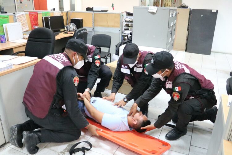 En la práctica realizada en el Complejo Estatal de Seguridad Pública de Tamaulipas se activó una alarma que indicó la evacuación del personal hacia la explanada principal, en donde se llevó a cabo un pase de lista y se simularon tres casos: quemaduras, inhalación de humo y lesiones por caídas.