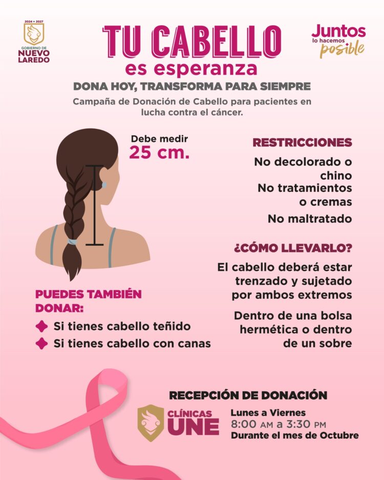 Nuevo Laredo, Tamaulipas.- El Gobierno Municipal invita a la ciudadanía a sumarse a una causa especial, donando cabello para elaborar pelucas que serán utilizadas por niños, adolescentes y adultos, víctimas de cáncer.
