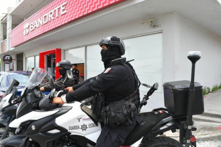 Ciudad Victoria, Tamaulipas.- Al presentar una mayor afluencia y actividad económica durante el denominado ‘’fin de semana más barato del año’’, personal de la Guardia Estatal mantiene la proximidad en bancos y cajeros para preservar la seguridad tanto para cuentahabientes como para el personal que labora en estas instituciones.