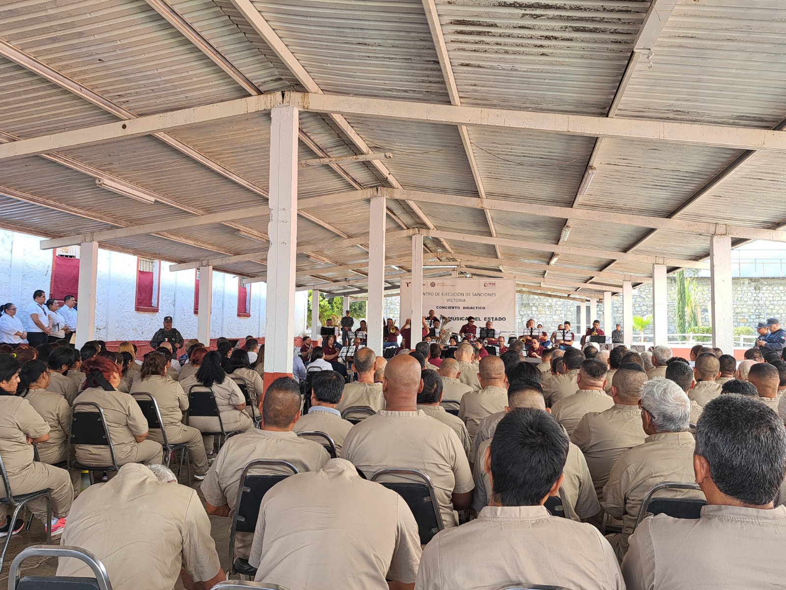Ciudad Victoria, Tamaulipas.-Por primera vez en su historia, personas privadas de la libertad (PPLs) disfrutaron de un concierto al interior del Centro de Ejecución de Sanciones (CEDES) de Ciudad Victoria a cargo de la Banda de Música del Gobierno del Estado de Tamaulipas, ensamble que presentó piezas representativas de la entidad, como “Tampico Hermoso”, “El Navegante” y “Victoria”; así como temas de Selena Quintanilla, Queen, clásicos del rock, cumbias y mambos; los cuales fueron disfrutados por un aproximado de 250 asistentes.
