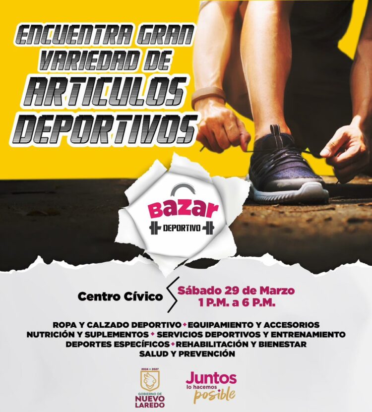 El Gobierno Municipal de Nuevo Laredo invita a la ciudadanía a participar en el Bazar Deportivo, un evento pensado para todos los amantes del deporte, donde podrán encontrar una gran variedad de artículos para entrenar con lo mejor en ropa, calzado, suplementos y más.