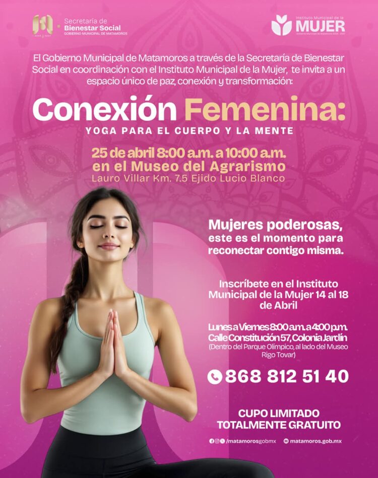 Esta iniciativa busca generar conciencia, promover el respeto y fortalecer el compromiso colectivo hacia una sociedad libre de violencia de género. Se trata del evento Conexión femenina: yoga para el cuerpo y la mente