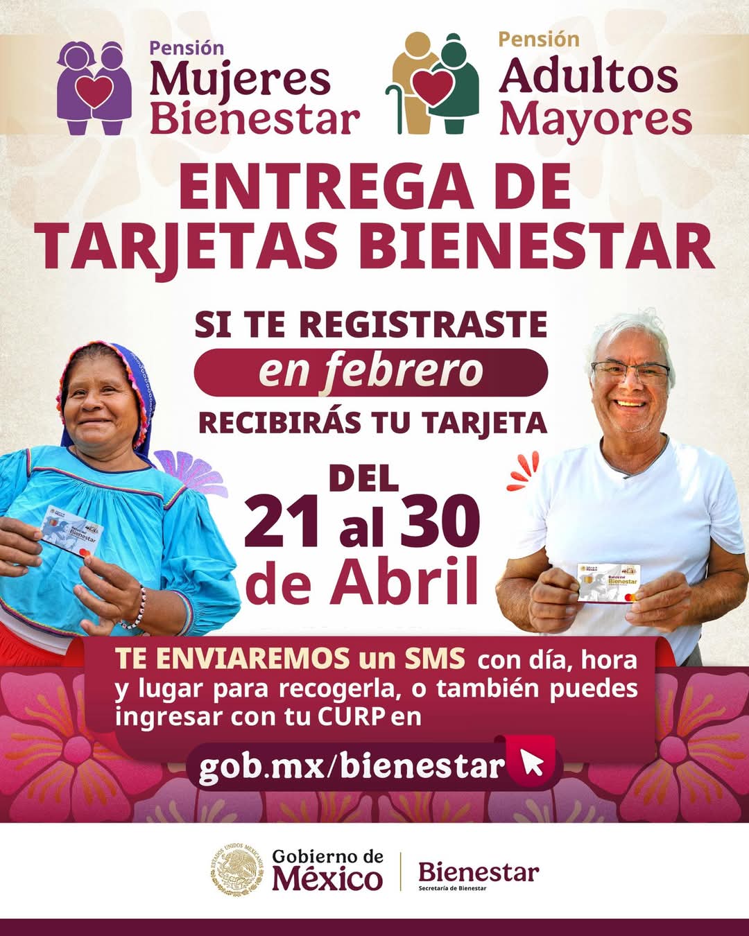 Si tú registró fue en febrero de 2025, del 21 al 30 de abril las y los beneficiarios ya registrados estarán recibiendo un SMS con el día, hora y lugar para recogerla, o también puedes ingresar con tú CURP a la página oficial de gob.mx/bienestar, entrar al link y seguir los pasos para saber en dónde puedes pasar a recoger tu plástico y dar el uso necesario.