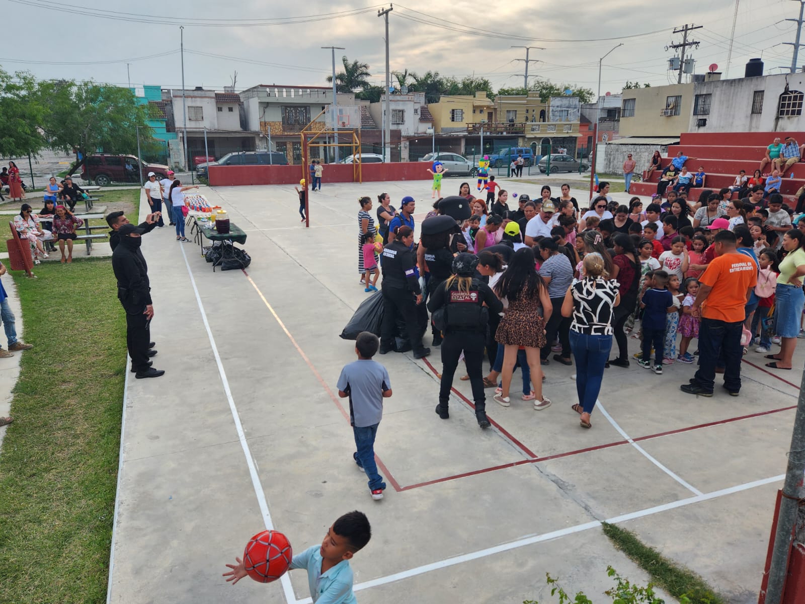 Matamoros, Tamaulipas.- En el marco de la conmemoración del Día del Niño y la Niña, personal de la Guardia Estatal participó en una convivencia con menores de edad en el Parque de Bienestar Social del fraccionamiento Estancias Residenciales, en el municipio de Matamoros.