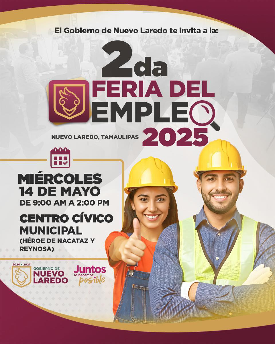 El Gobierno de Nuevo Laredo invita a la ciudadanía a participar en la 2da Feria del Empleo 2025, que se llevará a cabo el miércoles 14 de mayo en el Centro Cívico Municipal, ubicado en Héroe de Nacataz y Reynosa.