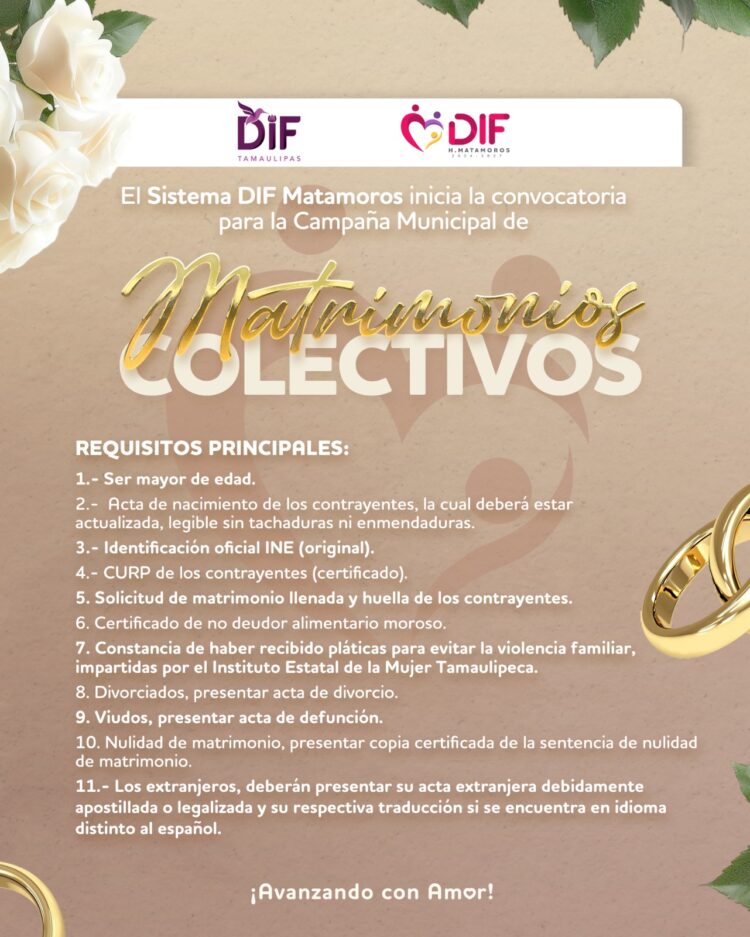 El Sistema DIF Matamoros que encabeza la Lic. Ana Ariceaga de Granados, continúa haciendo la a todas las parejas interesadas en contraer nupcias, a formar parte de la Campaña Municipal de “Matrimonios Colectivos”.